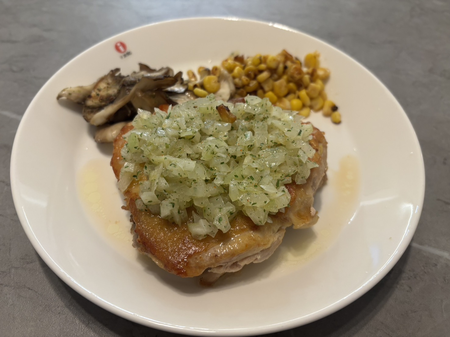 4.皮をパリッと焼いた鶏もも肉にソースをかけて完成です❕